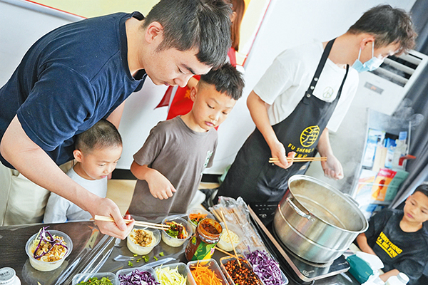 在工作人員指導(dǎo)下,家長(zhǎng)和孩子們分工合作,有的負(fù)責(zé)清洗蔬菜,有的負(fù)責(zé)煮面、過(guò)涼水,有的則負(fù)責(zé)調(diào)制醬料。不久,桌上就出現(xiàn)了一碗碗義烏風(fēng)味面條。(林曉燕)
