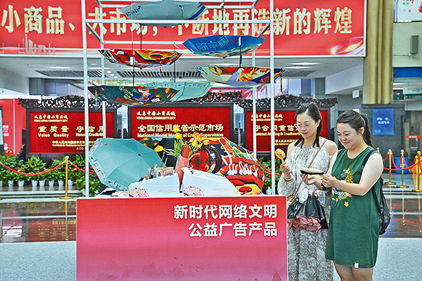 近日,國際商貿(mào)城四區(qū)一樓大廳內(nèi),舉辦了一場“新時代網(wǎng)絡(luò)文明公益廣告”商品展示進市場活動。傘具、畫框、茶具、燈籠、行李箱等上百件融合了“中國夢”圖案元素的小商品,令人目不暇接。(呂斌)