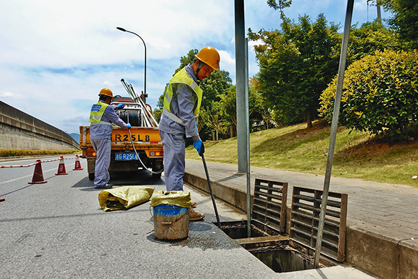 另一邊,位于環(huán)城南路和南景路交叉口處,疏通清撈組組員吳慶榮和葉佳開展雨水井的清撈工作。他倆分工明確,一個(gè)用清撈網(wǎng)撈出雜物,另一個(gè)用編織袋麻利地將雜物裝好。緊接著他們打開高壓水槍,繼續(xù)仔細(xì)清理管道深處。午時(shí)陽光毒辣,15分鐘的疏通作業(yè)已經(jīng)讓他們揮汗如雨。吳慶榮說:“這里是一處易積水點(diǎn),一旦遇到短時(shí)強(qiáng)降雨就容易積水。別看這幾天是大晴天,我們更要做好防汛準(zhǔn)備,疏通好這些管網(wǎng)?!?/div>