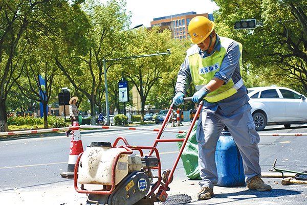 “我們現(xiàn)在修復(fù)用的都是冷補(bǔ)瀝青,施工方便的同時(shí)還能迅速干結(jié),能讓修復(fù)的路段即刻投入使用,方便市民出行?!瘪樈裾率痔祝檬滞竽ㄈヮ~頭與臉上的汗珠,笑著說:“最近天氣比較熱,我們能多修一處是一處?!?/div>