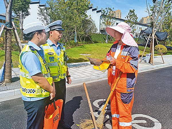 每到一處,交警都耐心地向環(huán)衛(wèi)工人介紹作業(yè)過程中應(yīng)注意的交通安全事宜,提醒他們在路面作業(yè)時一定要身著鮮艷的工作服,始終將“被看見,才安全”的理念貫穿工作之中。(陳聰)