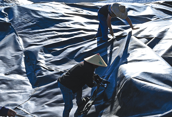 高溫考驗下,掀膜、覆膜、焊膜、庫區(qū)雨污分流、庫區(qū)環(huán)境衛(wèi)生保潔……10位操作工頂著烈日在垃圾堆體上完成各項工作。為順利打開垃圾開挖作業(yè)面,確保垃圾暴露面全覆蓋,防止垃圾臭味飄散,操作工們需要爬上“垃圾山”,全員齊心協力拉動覆蓋在垃圾堆的黑色HDPE膜。在高溫下,黑色HDPE膜的表面溫度高達70℃,操作工們必須借助“大力夾”才能完成掀膜、覆膜。