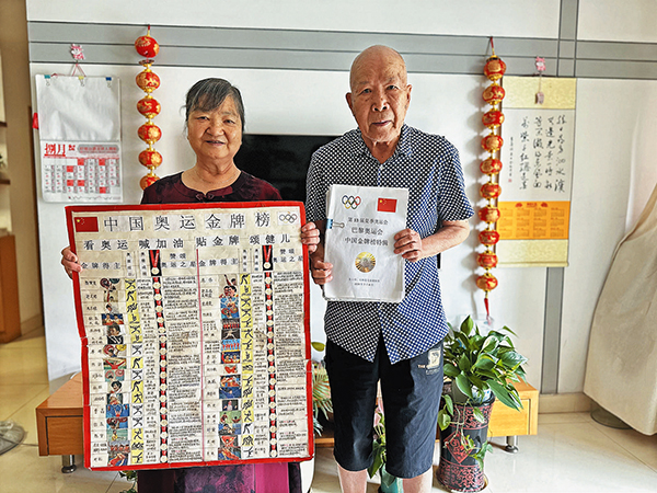 巴黎奧運會期間,對于家住稠城街道通惠門小區(qū)的退休教師吳士珍、石珠蓮夫婦來說,一家人除觀看奧運賽事和奧運新聞,還順利制成了第33屆夏季奧運會中國金牌榜特輯。實際上,2004年雅典奧運會,當時68歲的吳士珍和愛人石珠蓮就在家辦了奧運家庭專欄?!巴ㄟ^制作奧運金牌榜,記錄奧運健兒的奪冠瞬間?!痹趨鞘空浼抑校蛴浾咴敿毥榻B了自己的“奧運作品”。由于年事已高,相比以往,吳士珍完成這屆中國奧運金牌榜更不容易,需要花費大量的時間和精力。