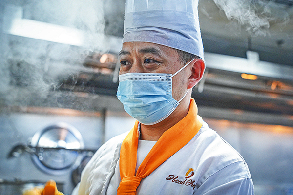 徐志翔今年45歲,是幸福湖國際會議中心廚師長,主要負責(zé)中餐的菜肴出品。自1997年進入后廚,從業(yè)已超27年。過油、調(diào)味、翻炒、抖鍋……只見他從容淡定、動作嫻熟、一氣呵成,很快便完成了一道色香味俱全的爆炒鮮鮑花。完成裝盤后,菜肴由服務(wù)員送至客人餐桌上。幾道菜炒完,徐志翔已是滿頭大汗,后背的廚師服也緊貼在了身上。