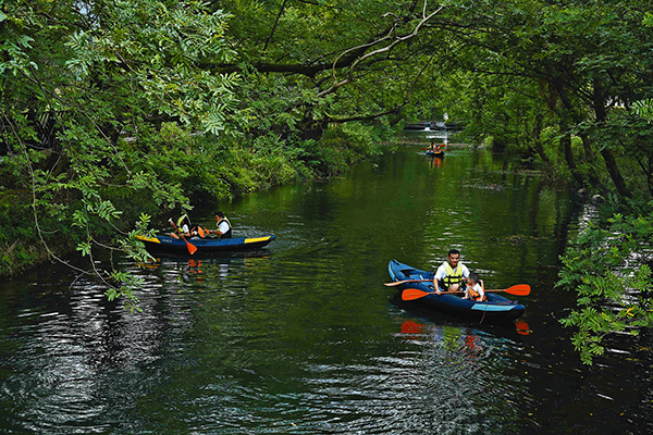 8月11日下午,赤岸鎮(zhèn)三角毛店村五里白溪的潺潺溪流間,家長帶著孩子一起劃船蹚水游泳捉魚,盡享鄉(xiāng)村清涼。