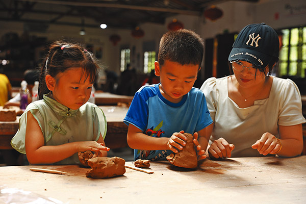 另一邊的陶藝體驗區(qū)內(nèi),游客們圍坐在陶輪旁,手中握著濕軟的陶泥,隨著陶輪緩緩旋轉(zhuǎn),他們的手指靈活地捏塑、按壓,將一塊塊平凡的泥土塑造成形態(tài)各異的陶藝作品。來自美國的瑪利亞第一次嘗試制作陶藝,體驗了15分鐘的她最終完成了一個精致的小花瓶。“做陶藝非常有意思,同時也很考驗?zāi)托??!爆斃麃啽硎?,這次難忘的體驗,讓她感受到了中國傳統(tǒng)文化的魅力和濃厚的節(jié)日氛圍。