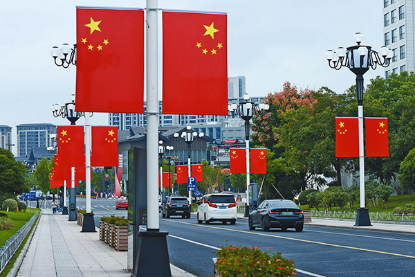 縣前街,遠(yuǎn)遠(yuǎn)望去一派喜迎國慶的“中國紅”。 國慶節(jié)臨近,義烏的新馬路、城中路、機(jī)場路、黎明湖路等城市主次干道,通過懸掛國旗、布置主題綠化景觀等形式,打造了一道道美麗的風(fēng)景線,喜慶的節(jié)日氛圍撲面而來。(呂斌)
