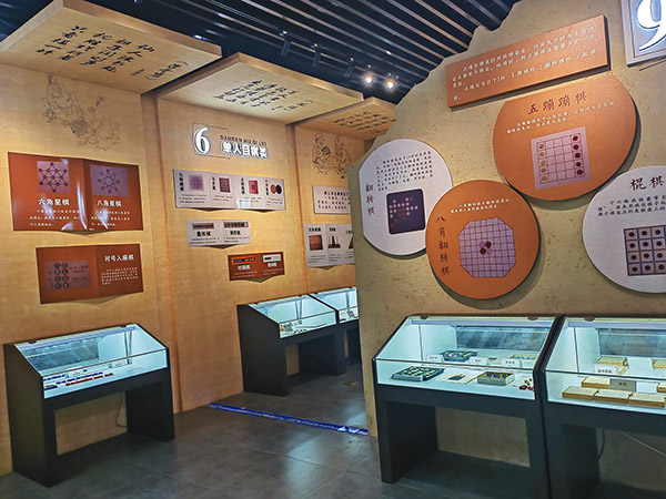 徑直走入展廳,俯拾皆是各類棋文化的科普展陳。中國圍棋、中國象棋、中國民間棋及國外民間棋的相關(guān)介紹一應(yīng)俱全,部分中國棋類大師的簡要事跡亦一覽無余。踱步其中,仿佛置身于棋類世界的歷史長河中。在館藏的300多種各類棋中,不乏珍品。其中,民間棋以12種類別進(jìn)行區(qū)分,綱目明晰,過目難忘。屏風(fēng)式四子棋像屏風(fēng)一般站立,柵欄式四子棋也如柵欄般圍合,升官圖棋的棋譜被密密麻麻的字體包圍,民國陸戰(zhàn)棋由木色方塊的棋子組成,分六煲棋則以核桃狀制品為棋子……看似五花八門,實(shí)則妙趣橫生。館內(nèi)還設(shè)置了兩個(gè)大顯示屏,以及一臺(tái)可自行下棋的智慧屏,讓人身臨其境,樂在其中。
