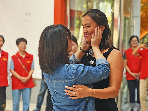 “姐姐!”這是倪玫第一次喊出這句中文,她一把抱住了站在自己眼前這個(gè)素未謀面的姐姐,寵溺地用手撫摸著對方的頭發(fā),低聲安撫情緒激動的姐姐。這個(gè)遲來的擁抱,感動了在場的所有人,這一刻,倪玫和姐姐都圓夢了,她們團(tuán)圓了!