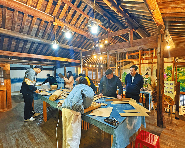 陳豐松(右一)在神壇村“童美藝術(shù)”空間觀摩中華鼎的制作