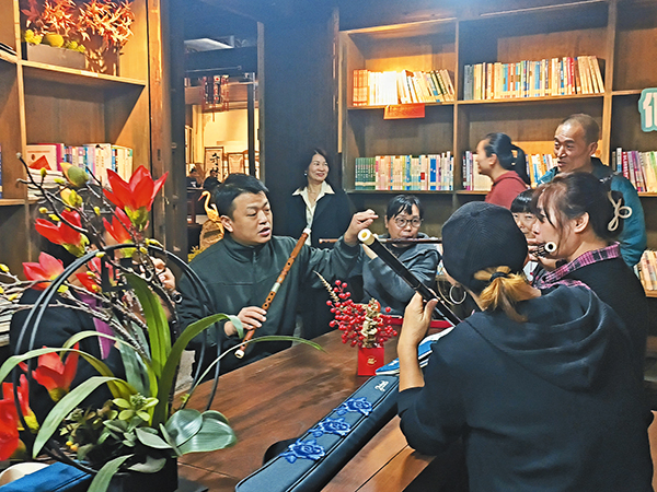 賴馬杰(左一)指導(dǎo)村民吹笛子