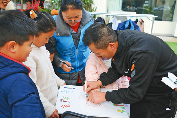 孩子們邀請(qǐng)路人參加“手勢(shì)打卡”。