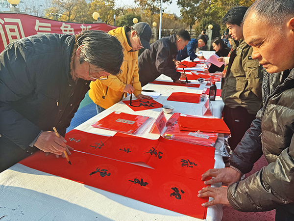 活動邀請楊守春、張風明、季懷、鄒其壽、陳建邦等本地書畫名家及駐義部隊書法愛好者,在丹溪小區(qū)廣場現(xiàn)場書寫春聯(lián),將一副副象征幸福和美好的春聯(lián)送給北苑居民?!罢垘臀視鴮懸桓贝郝?lián),謝謝老師!”丹溪社區(qū)居民付先生早早等候在春聯(lián)書寫區(qū),得到了當天第一副由本地書畫名家送出的新春祝福。