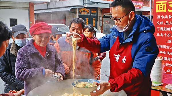 “以前午飯一般都是早上做好帶來,到了飯點再找地方熱一下,天氣不冷就直接吃了,現(xiàn)在好了,可以吃一碗不要錢的熱乎面?!杯h(huán)衛(wèi)工人老張說,吃的次數(shù)多了,大家也相熟了,每次來都主動給楊老板洗個菜什么的,打打下手?!坝写嗡图r偶爾發(fā)現(xiàn)的,燒得不錯,辣辣的,有老家的味道?!苯骷爝f小哥老厲由衷地給這位愛心老鄉(xiāng)點贊。