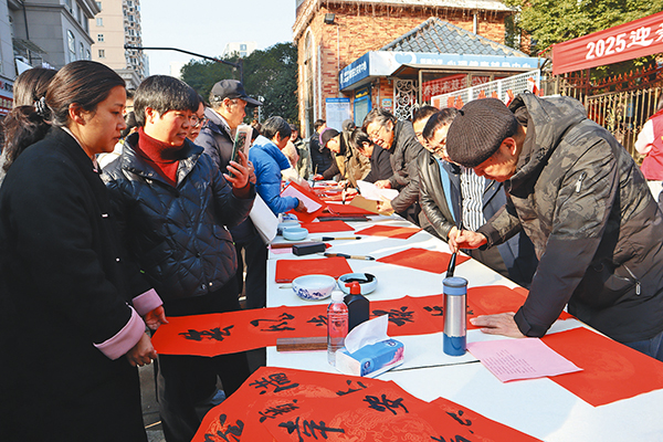 活動期間,書法愛好者筆走龍蛇,一副副飽含幸福吉祥、寄托美好愿望的春聯(lián)及“福”字躍然紙上,洋溢著濃濃的年味。本次活動持續(xù)到中午,書法愛好者共送出近1500副春聯(lián)和“?!弊?。(龔盈盈)
