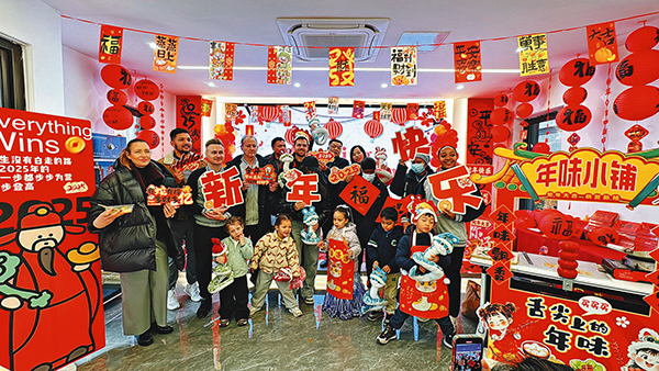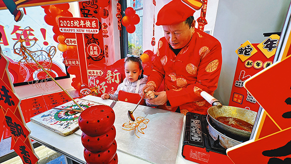 現(xiàn)場(chǎng),來自美國、南非、哥倫比亞等國家的15組外國友人家庭與本地居民歡聚一堂,沉浸式感受中國傳統(tǒng)節(jié)日文化。包餃子、畫糖畫、寫漢字、DIY蛇頭帽……活動(dòng)現(xiàn)場(chǎng),孩子們踴躍參加各個(gè)項(xiàng)目,玩得不亦樂乎。在一旁的家長們也沒閑著,有學(xué)著寫對(duì)聯(lián)的,有參與包餃子和湯圓的,現(xiàn)場(chǎng)氣氛溫馨融洽。(林曉燕)