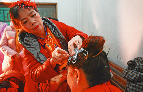 1月21日,村晚表演者互相幫助佩戴頭飾。