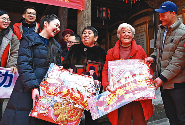 外商志愿者給老年人贈送寶娟年畫和掛歷。