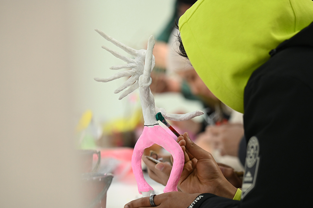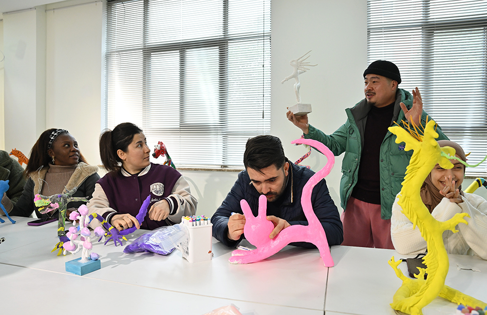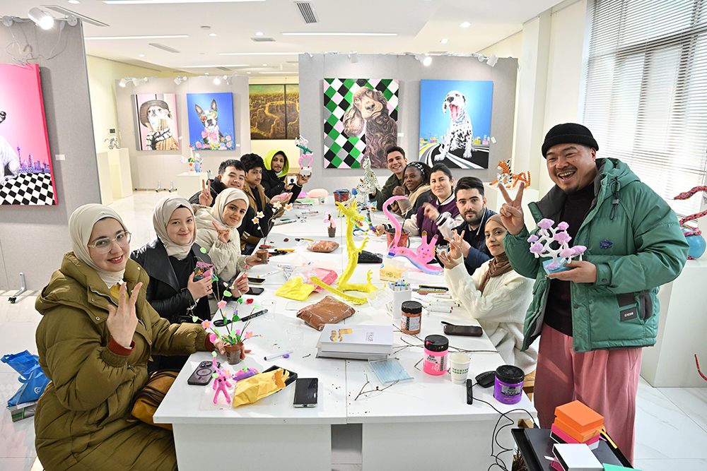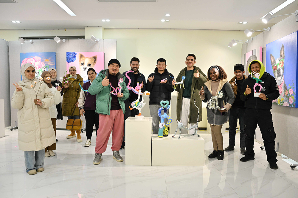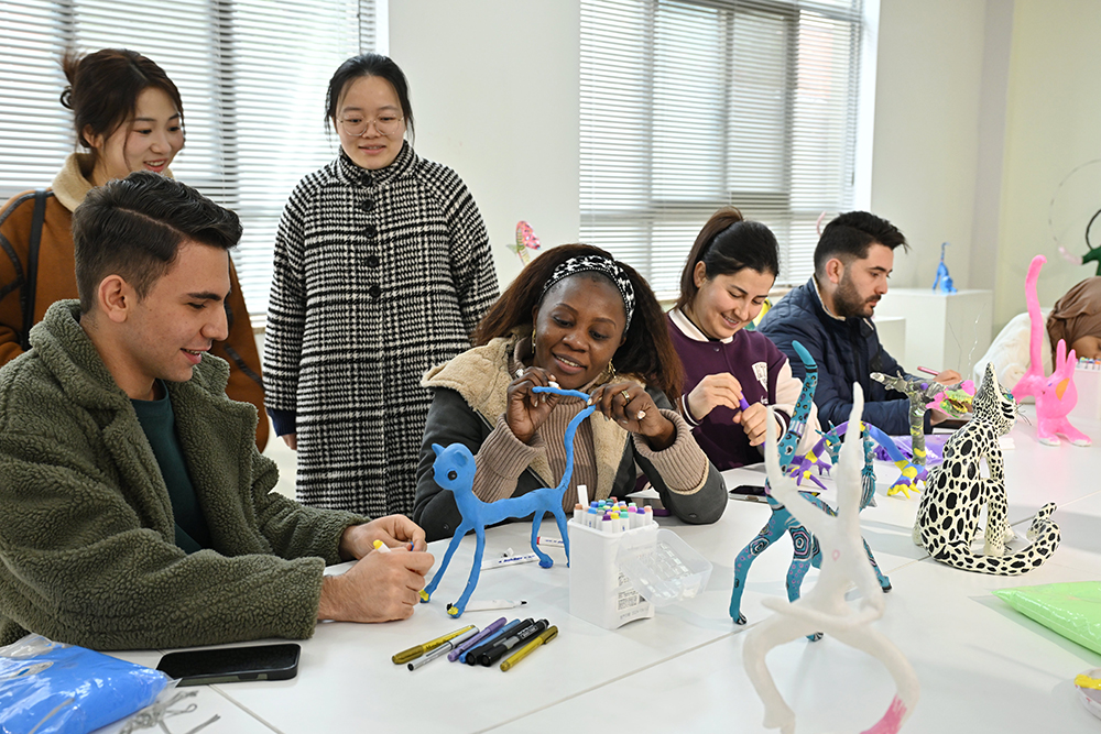來自突尼斯、塞內(nèi)加爾、也門等國的國際友人和當(dāng)?shù)鼐用?,在義烏工商學(xué)院藝術(shù)導(dǎo)師邵永紅的指導(dǎo)下,用廢棄紙杯、鐵絲、黏土等日常廢品化身藝術(shù)創(chuàng)作的主角,將環(huán)保理念融入童趣視角,以藝術(shù)為媒,共繪創(chuàng)作環(huán)保造型藝術(shù),搭建起中外文化交流的綠色橋梁。