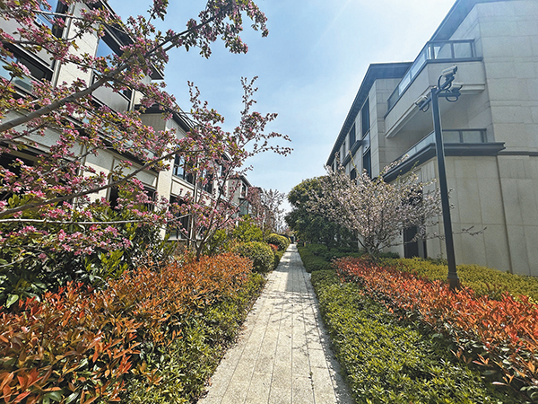 高層住宅樓下,年輕的媽媽?xiě)驯雰鹤诓萜哼叺氖噬蠒裉?yáng),微風(fēng)徐來(lái),花香彌漫。沿著平坦整潔的小區(qū)道路往排屋區(qū)走去,只見(jiàn)兩旁櫻花、梨花競(jìng)相綻放,一位姓吳的男業(yè)主和妻子正在門(mén)口等著已訂購(gòu)的綠植送貨上門(mén)。