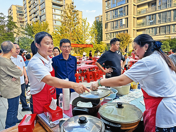 鄰里節(jié)活動(dòng)在鏗鏘有力的開(kāi)場(chǎng)大鼓中拉開(kāi)帷幕。居民們手持餐盤(pán)穿梭于美食長(zhǎng)桌間,邊品嘗美食邊聊家常,現(xiàn)場(chǎng)其樂(lè)融融?!斑@肉餅,我準(zhǔn)備了一上午,大家嘗嘗!”“這面食勁道,搟面功夫了得!”居民們圍坐在一起,分享美食與故事,陌生感在煙火氣中悄然消融。