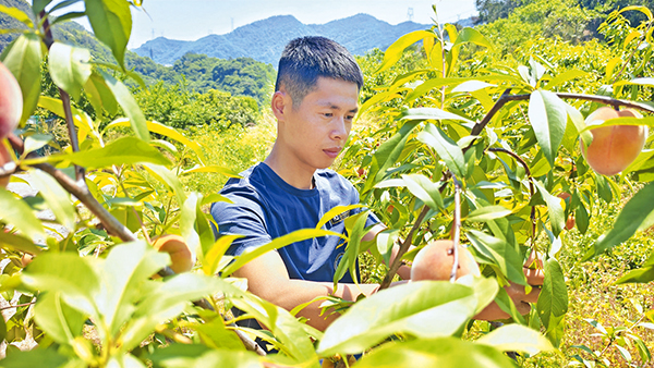 正是鮮桃成熟時(shí)。一顆顆圓圓的果子由綠轉(zhuǎn)黃,尾巴上還帶著一抹紅,仿佛圓滾滾的小燈籠,十分惹人喜愛(ài)。輕輕湊近,淡淡的果香縈繞鼻尖,勾得人心里直癢癢,也讓何進(jìn)進(jìn)滿是歡喜。他說(shuō):“它們就像我的孩子一樣。”每天到園子里轉(zhuǎn)一圈是他的固定工作,常常忙起來(lái)一天到晚不著家。