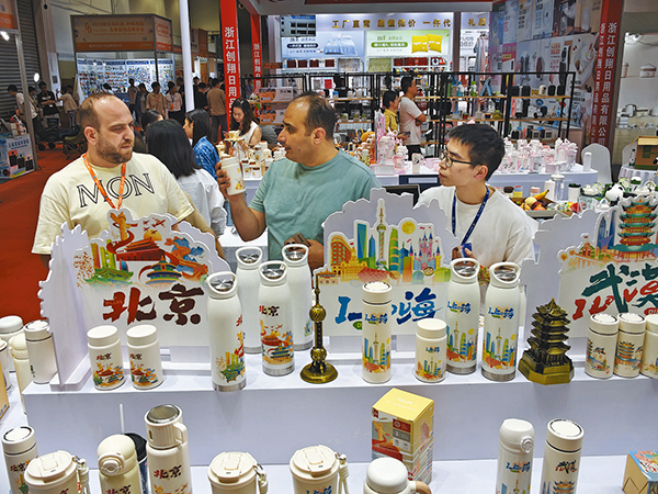 圖為采購(gòu)商們正在選購(gòu)以中國(guó)城市地標(biāo)元素為主題的系列文創(chuàng)杯子。(呂斌)