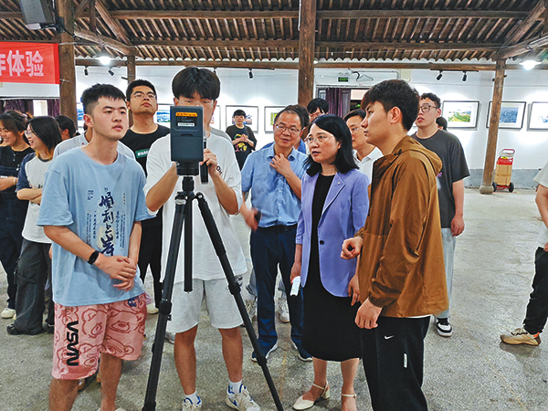 盛湘君(右二)在科普活動現(xiàn)場觀摩三維建筑掃描成像技術(shù)