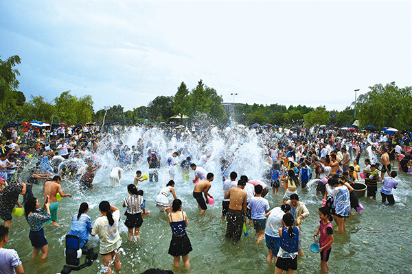 此后,酣暢淋漓的潑水正式開啟,只見游客們手持水盆、水槍等工具肆意揮灑,歡笑聲與尖叫聲此起彼伏,水花在空中劃出弧線,洗去了夏日的燥熱。