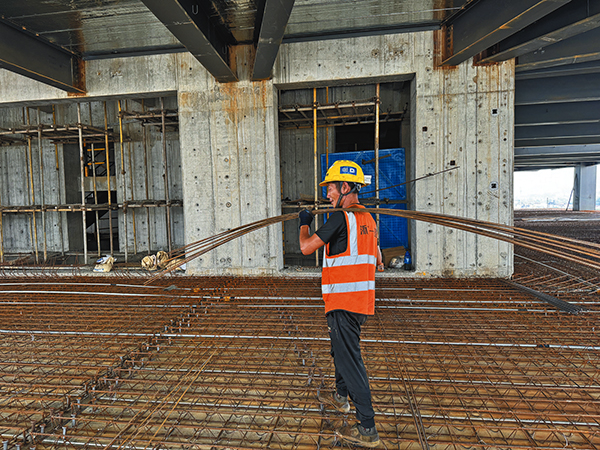 陳師傅的工作任務(wù)是綁扎鋼筋,只見他半蹲著身子,熟練地拿起扎鉤和扎絲,把兩根交叉的鋼筋緊緊固定在一起。我跟在旁邊,想試著幫忙遞扎絲,可面對眼前密集交錯的鋼筋,手指摸索著,一時竟不知該把扎絲準(zhǔn)確遞到哪個位置,動作格外生疏。而陳師傅盡管戴著有些磨損的工具手套,動作卻行云流水,絲毫不受影響。