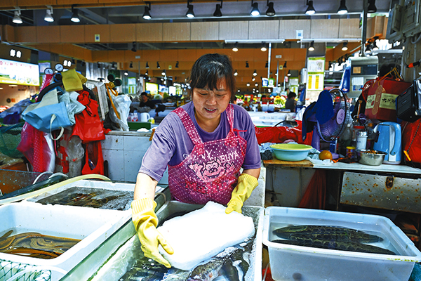 菜市場(chǎng)經(jīng)營(yíng)戶用冰塊為海鮮降溫。
