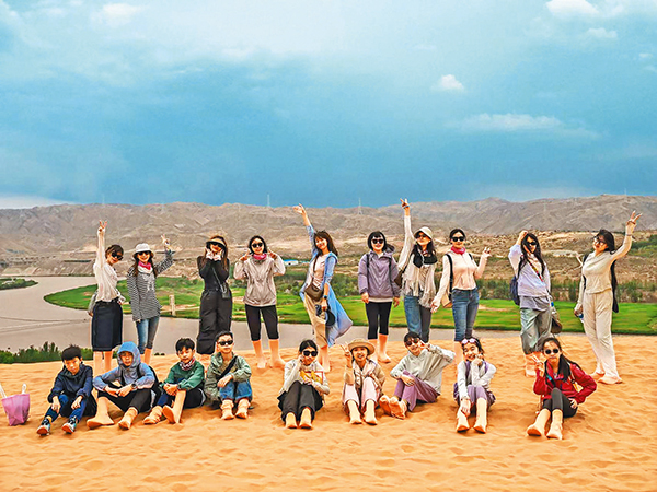 在寧夏沙坡頭景區(qū)的金色沙丘上,13歲的小T正興奮地滑沙,笑聲回蕩在曠野中?!吧衬峭耆灰粯拥娘L(fēng)景,好玩!”這位義烏的小學(xué)六年級畢業(yè)生說。她的母親黃莉是一名“80后”家長,這次帶著孩子參加了同學(xué)媽媽組織的畢業(yè)旅行。她們一行9組家庭,行程8天7晚:第一天落地銀川,參觀寧夏博物館、品嘗手抓羊肉;第二天探索沙坡頭景區(qū);之后幾天,孩子們在星星酒店觀星、沿66號公路旅拍、夜宿黃河宿集,還觀瞻了賀蘭山巖畫,體會了懷遠(yuǎn)夜市的風(fēng)情。最讓小T難忘的是五湖穿越——長達(dá)7個小時的行進(jìn)中,地形崎嶇復(fù)雜,孩子們起初緊張得手心冒汗,但最終互相鼓勁完成挑戰(zhàn)?!耙郧爸辉谡n本里見過沙漠,現(xiàn)在親身經(jīng)歷,才知道世界這么大?!秉S莉說。她利用各種假期帶孩子去過20多個國家和地區(qū),這次朝夕相處,家長間也拓寬了朋友圈,孩子們更在集體行動中學(xué)會團(tuán)結(jié)協(xié)作。