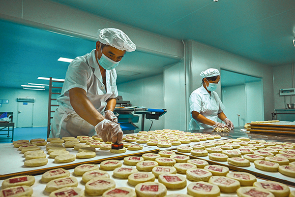 距離中秋節(jié)還有兩個月,義亭鎮(zhèn)早已飄出縷縷月餅香氣。8月6日上午,記者走進位于義亭鎮(zhèn)的義烏市供銷食品有限公司生產(chǎn)車間,看見工人們各司其職,揉面、包餡、蓋紅章、烘烤……一道道工序有條不紊地進行著。隨著烤爐“叮”的一聲響,金黃油亮的義亭月餅新鮮出爐,濃郁的酥香彌漫著整個生產(chǎn)車間。