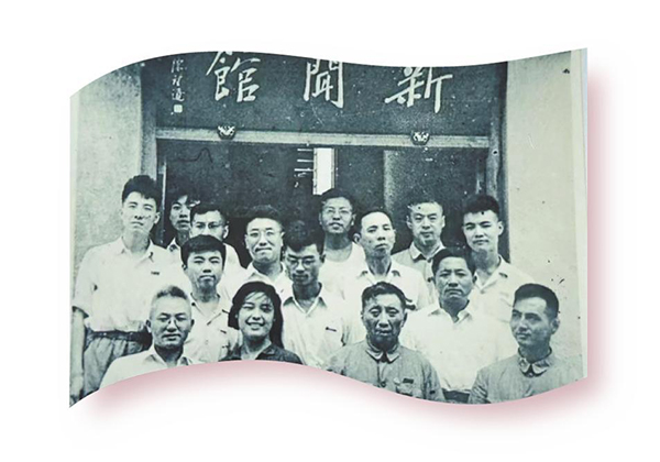 1945年,陳望道(前排右二)與新聞系師生在新聞館前。