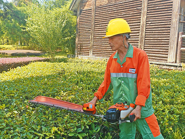 “公園里樹多草多,看著涼快,其實(shí)還是很悶的。”修剪告一段落,易師傅的工作服,早已被汗水浸透成深色一片。他摘下手套,手掌被機(jī)器震得有些發(fā)紅,指關(guān)節(jié)處是厚厚的繭子。他拿起超大號的塑料水壺,灌了幾大口水,用袖子抹了一把臉上的汗,指著旁邊剛修剪整齊的綠籬說:“雖然每天重復(fù)一樣的工作,但當(dāng)看到植物長得越來越好,我就覺得很值?!?/div>