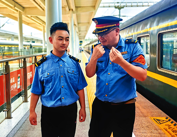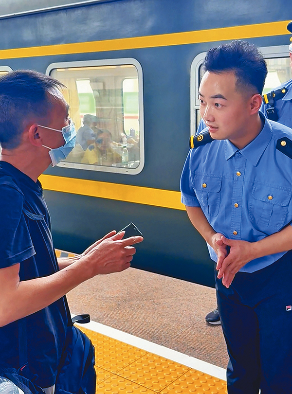 “我的孩子上車了沒有,能不能幫我查一下?”“這是K833次列車嗎?”“8號車廂往哪邊走?”一連串的問題讓我有些不知所措。在悶熱、嘈雜的環(huán)境中,如何保持清醒、有條不紊地解答旅客的各類問題,是我面臨的一大挑戰(zhàn)。在繆旭亮的悉心指導(dǎo)下,我逐漸熟悉了業(yè)務(wù),和其他客運(yùn)員一道,引導(dǎo)旅客有序乘降。