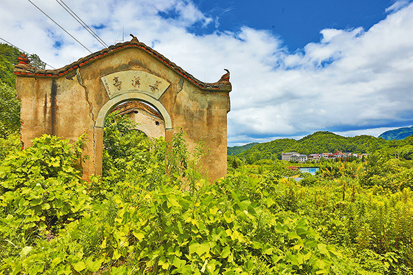 其中,處于善坑嶺腳的“善溪亭”至今仍存。在該亭的南北兩面同設有拱門,門洞正對主路,形成穿堂之勢,墻頂則采用反拋物線設計,如弓蓄勢,卻在剛硬的墻面中融入了一絲柔美。在東面墻體的左右各辟有一個圓窗,中空若鏡。行人穿亭而過,山風貫堂,似能洞穿肺腑。穿過善溪亭,不遠處即是諸暨的宣何街。在經(jīng)年累月的風霜侵蝕下,如今的善溪亭亭頂早已坍塌,獨余四壁仍倔強地刺向蒼穹,讓原本的“穿心亭”反成了“穿天”之勢。周圍叢生的雜草足有一人多高,唯有門楣上的“善溪亭”等字跡依舊清晰可見,似乎還在訴說著往昔的榮光。