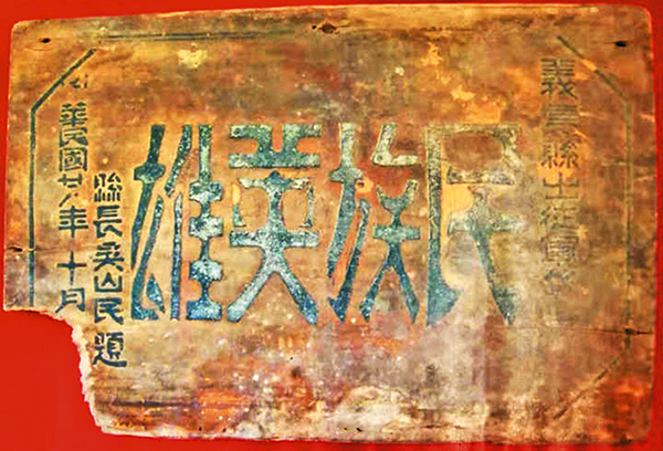 吳山民為抗日軍屬頒發(fā)的“民族英雄”牌匾。