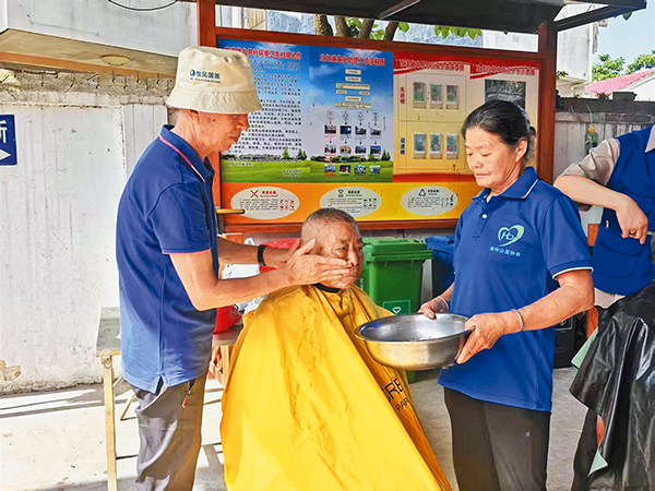 劉金福(左一)參與義務活動,為老人刮胡子。