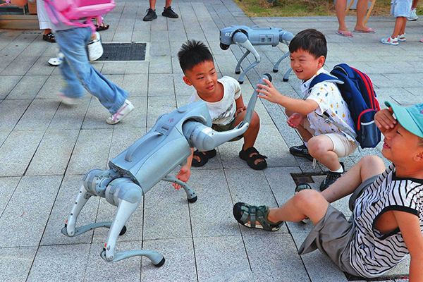 聯(lián)港小學(xué)兩只機(jī)器狗與小朋友互動(dòng)玩耍。