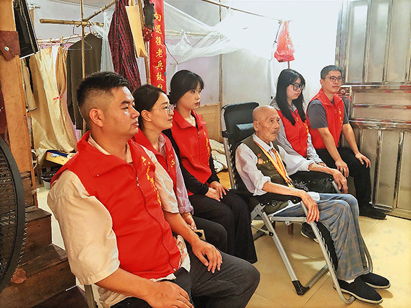 百歲老兵(左四)與志愿者共同觀看閱兵儀式