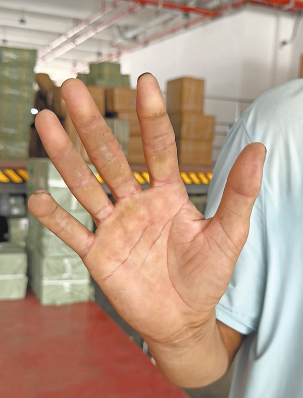 幾分鐘的休整轉(zhuǎn)瞬即逝,我們再次投入貨物的搬運(yùn)中。持續(xù)勞作之下,我逐漸感到右邊身體的肌肉開始酸痛。這批貨雖然只有50件,但是每件貨的重量有30公斤。沒搬幾件,我就感覺手指被磨得生疼、漸漸紅腫,渾身也使不上勁。于是我不得不退到一旁休息,付師傅立刻接替了我的位置,一件接著一件地搬,動(dòng)作幾乎沒有停頓。站在一旁的我,注意到付師傅膚色黝黑,手已沾滿灰塵,手掌上布滿了厚厚的繭子。