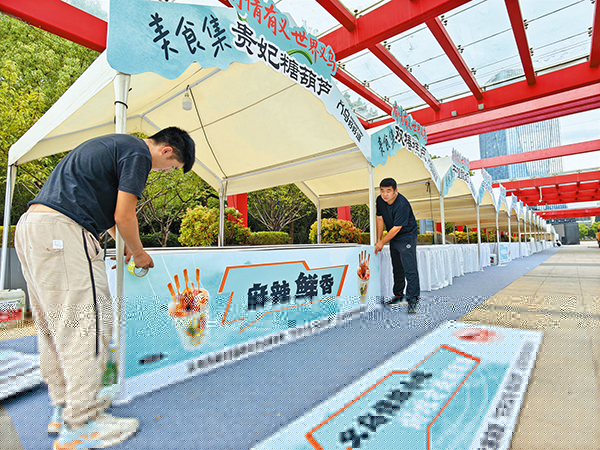 昨日下午,義烏國際博覽中心廣場,工作人員正在為義烏市第33屆群眾文化展演暨“打開義烏 遇見世界”義烏好好逛無限嘉年華美食市集精心布展。(呂斌)