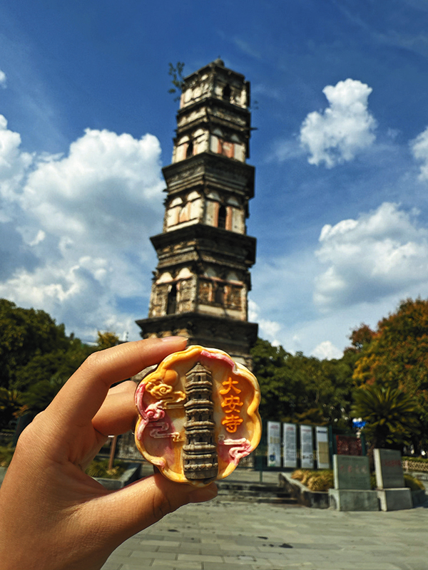 她的靈感源于一份“不甘心”。“看到別的旅游城市都有代表自己文化的小點心,我就想,義烏為什么不能有?”傅亞琴說。為了這份情懷,7月,她就帶著團(tuán)隊開始籌備。設(shè)計圖紙、3D建模、反復(fù)打樣,過程充滿挑戰(zhàn)。她甚至跑到赤岸鎮(zhèn)古月橋、稠城大安寺塔下實地采風(fēng)?!罢驹诠旁聵蛳?,那種感覺特別不一樣,就想把這份屬于義烏的印記‘刻’進(jìn)月餅里?!背嗽煨偷臉O致追求,傅亞琴在口味上也下足功夫。考慮到當(dāng)下的健康趨勢,她調(diào)整配方,減油減糖,并在餡料中融入芝麻、紅棗、茯苓等養(yǎng)生食材,餅皮則選用了細(xì)膩的桃山皮。