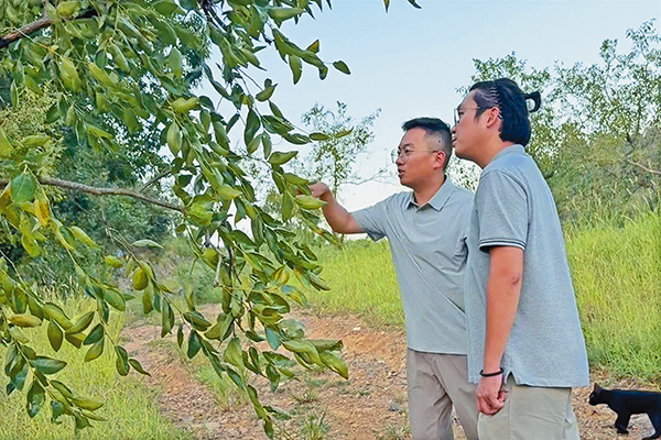 黃凱(左)與駱潤來正在查看棗樹情況。