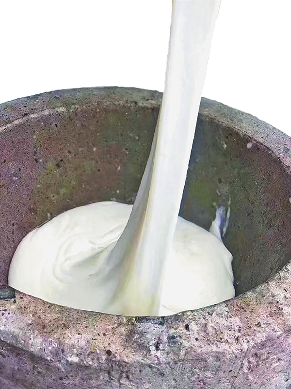 將蒸好的糯米倒入老石臼中,接下來就是最費力也最關鍵的捶打環(huán)節(jié)。錢威拿起木杵,開始反復捶打糯米。木杵的重量不輕,每一次捶打都需要耗費不小的力氣。捶打的過程中,還要不時地用沾了水的手將石臼邊緣的糯米刮下來,再繼續(xù)捶打,確保每一粒糯米都被充分捶打均勻?!按反虻牧Χ群皖l率都有講究,力度要適中,頻率要均勻,這樣才能讓糯米產(chǎn)生足夠的黏性,做出的麻糍才會柔而不爛、韌而不硬。”錢威解釋。