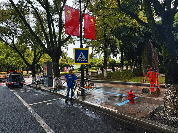 而在這份詩(shī)意的背后,是一群默默躬身的身影:他們手持掃帚穿梭于地磚縫隙之間,推著高壓水槍沖洗欄桿上的塵埃,蹲下身去清理綠化帶中的煙蒂與紙屑……