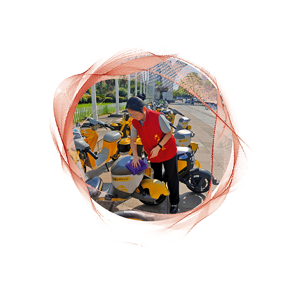 近日,在國(guó)際商貿(mào)城門(mén)口,數(shù)名身穿紅色馬甲的年輕人正彎腰擦拭共享單車(chē)座椅,扶正傾斜的電動(dòng)自行車(chē),并用濕布仔細(xì)清潔車(chē)把手上的指紋與灰塵?!坝行┯慰万T完車(chē)就走了,車(chē)子隨意停放,既不安全也不美觀?!币晃磺嗄曛驹刚哒f(shuō),我們多做一步,城市就美一分。
