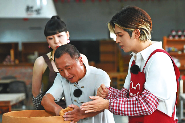 從古法點(diǎn)火、燒制工序,節(jié)目嘉賓們邊走邊認(rèn)真聽取傳承人的講解。當(dāng)他們觸摸龍窯內(nèi)壁上經(jīng)年累月的窯汗,仿佛穿越時(shí)空,置身歷史長河。龍窯是我國窯爐的一種形式,多建在江南坡地上。窯身呈長條形,自下而上,依山就勢而建,窯室上覆蓋的保溫層微微隆起,蜿蜒在半山坡上,形似龍,故名龍窯。龍窯主要采用柴燒形式,利用薪柴作為燃料燒制陶瓷。作為一種古老技藝,柴燒獨(dú)有的自然落灰釉是電器窯等燒制的陶藝作品所無法呈現(xiàn)的?!叭嗄嘁袢嗝鎴F(tuán),得把空氣全排出去,不然燒的時(shí)候會裂?!标愒讫堈菩恼粗鴿駶櫟奶漳?,原本松散的泥團(tuán)在他手中漸漸成形,嘉賓們個(gè)個(gè)躍躍欲試,沉浸式感受陶器制作的樂趣與魅力。選泥、練泥、拉坯……整個(gè)過程中,陳云龍叮囑大家,老規(guī)矩不能丟。他舉起一個(gè)剛拉好的陶坯,看弧度,全憑手感控制,做出溫潤的線條。