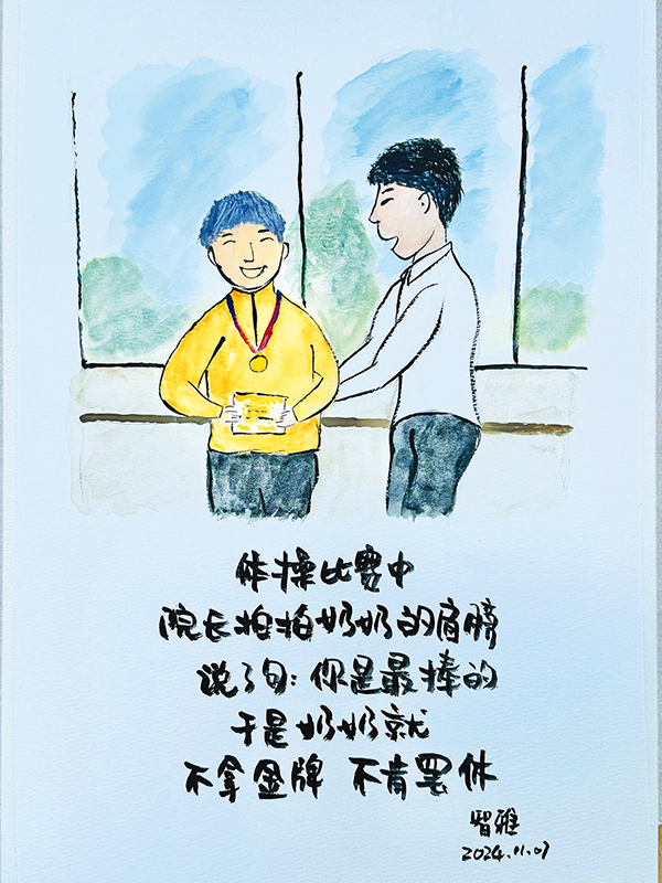 還有一幅畫作記錄了一幕充滿“孩子氣”的畫面:在一次體操比賽中,陳智雅拍了拍90歲的吳奶奶,說了一句“你是最棒的”。于是,吳奶奶不拿金牌不肯罷休,甚至“絕食抗議”。陳智雅趕緊給她補發(fā)了金牌,此后,這塊金牌就掛在吳奶奶的脖子上摘不下來了。